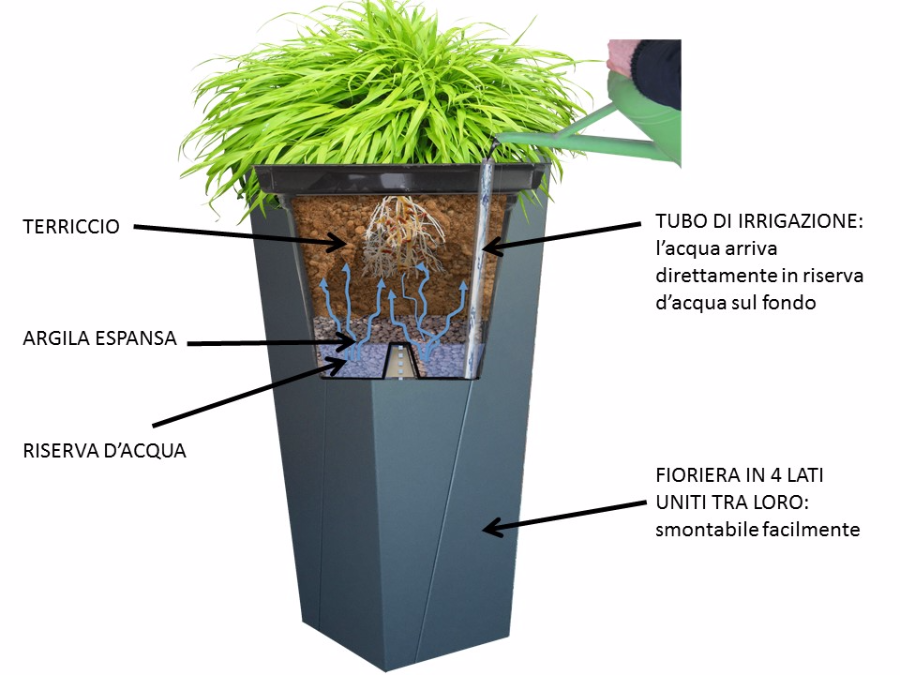 Il vaso in ABS removibile con riserva d’acqua è cm. 43×43 e profondo 33 cm. I 4 piedini regolabili in altezza (2-5 cm) per compensare eventuali dislivelli della pavimentazione in esterni.